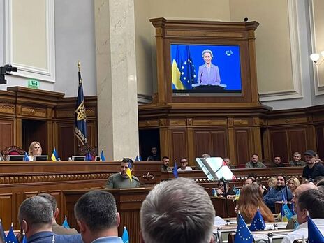 На засіданні парламенту урочисто внесли прапор Євросоюзу. Також перед депутатами виступила президентка Єврокомісії Урсула фон дер Ляєн. Вона заявила, що Україна має "дуже чітку європейську перспективу".
