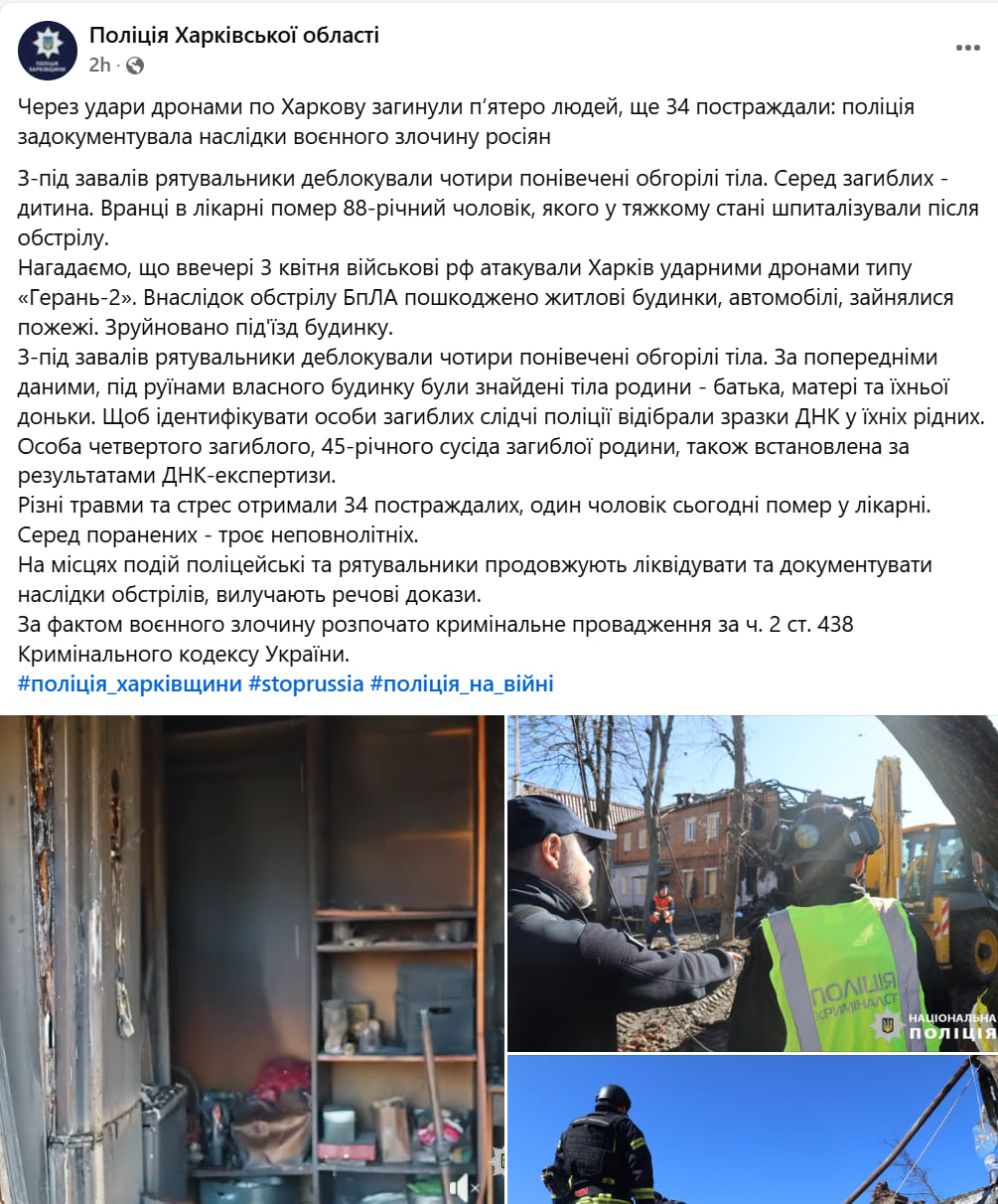 Правоохоронці розповіли, що один із загиблих – 88-річний чоловік, він помер у лікарні від травм. Ще чотири понівечені обгорілі тіла рятувальники деблокували з-під завалів будинку, у який влучив ворожий БПЛА. За попередніми даними, це тіла батька, матері, доньки та їхнього сусіда.