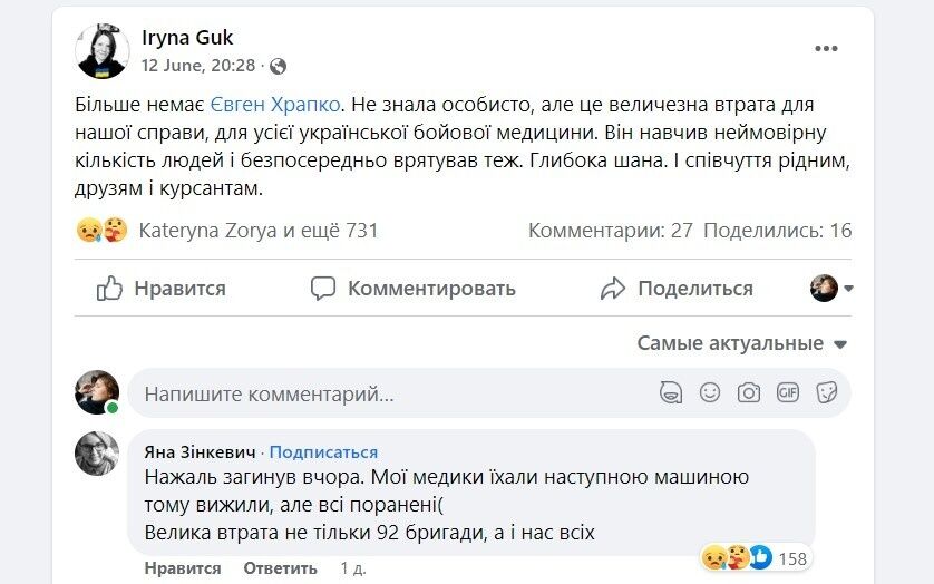"Від початку повномасштабного вторгнення Женя пішов служити у 92-гу бригаду – працював у медичній евакуації, вивіз і врятував сотні поранених і загинув, роблячи те, у що він вірив і що любив", – написала Макарова.