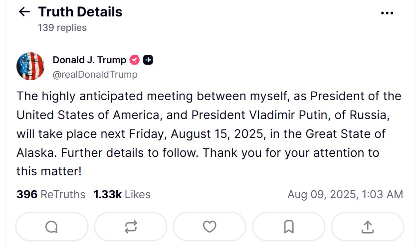 Президент США Дональд Трамп 8 серпня у своїй соцмережі Truth Social указав час і місце своєї майбутньої зустрічі з нелегітимним президентом країни-агресора РФ Володимиром Путіним.
