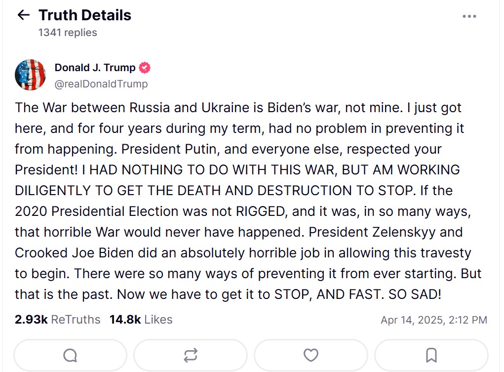 "Було так багато способів запобігти її початку. Але це минуле. Тепер ми маємо змусити це зупинитися, і швидко. Дуже шкода!" – написав глава Білого дому.