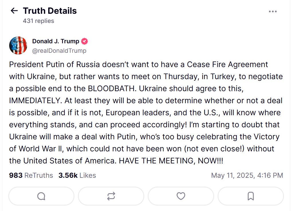 10 травня лідери Франції, Німеччини, Польщі, Великобританії, чиї країни входять до "коаліції охочих", зустрілися в Києві. Вони погодилися, що з понеділка, 12 травня, має бути повне й безумовне припинення вогню в Україні щонайменше на 30 діб, "не обмежене жодними умовами", і застосування жорсткіших санкцій проти РФ у разі її відмови.
