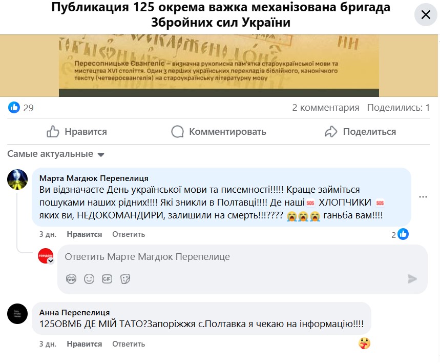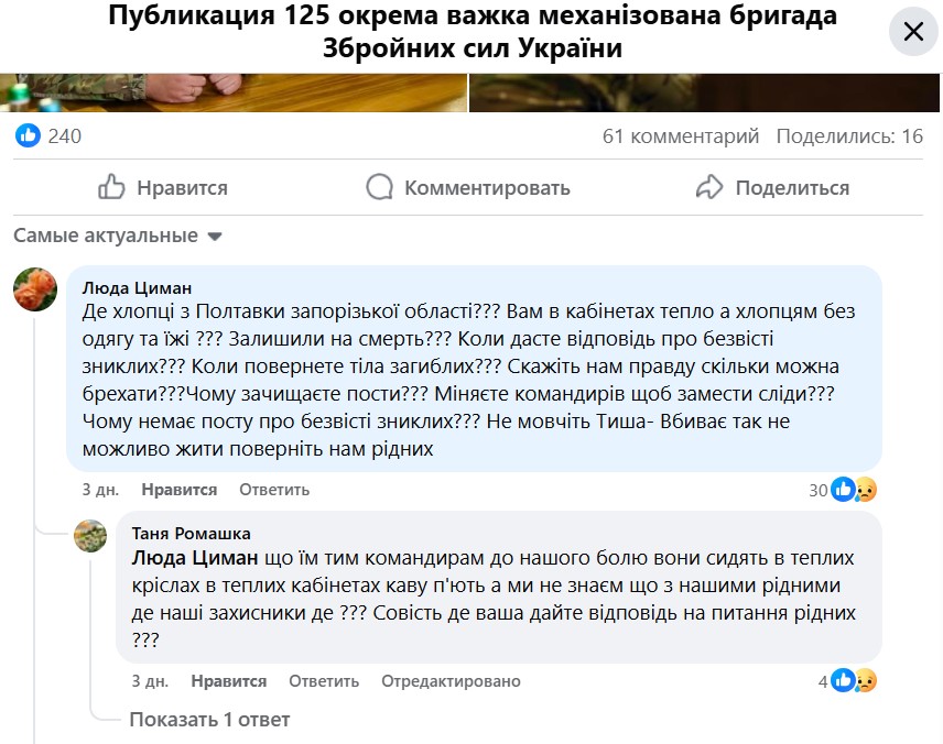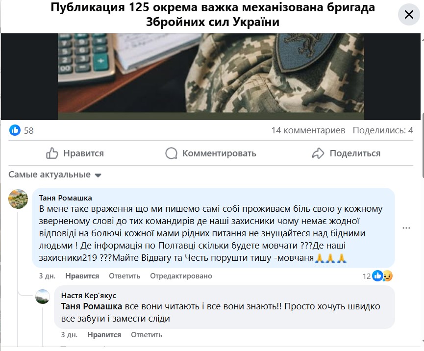 До цього під публікаціями 125-ї ОВМБр з'явилися численні коментарі від родичів, які вимагають роз'яснити обставини їхнього зникнення.