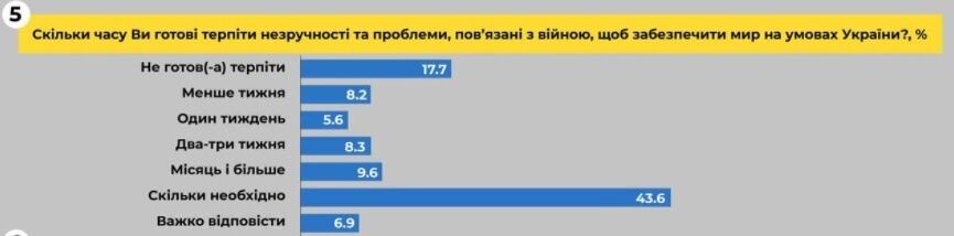Під час соцдослідження ставили запитання: "Скільки часу ви готові терпіти незручності та проблеми, пов'язані з війною, щоб забезпечити мир на умовах України?"