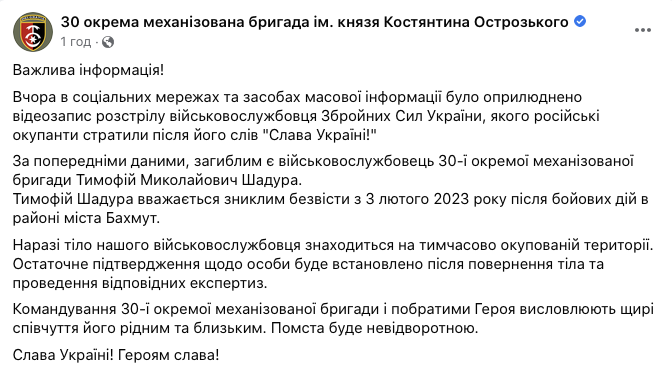 Командування 30-ї окремої механізованої бригади імені князя Острозького Збройних сил України вважає, що український військовослужбовець, якого російські окупанти розстріляли після слів "Слава Україні", може бути бійцем бригади. Про це пресслужба 30-ї ОМБр 7 березня повідомила у Facebook.