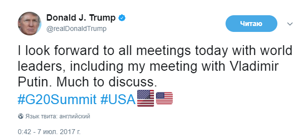 Президент США Дональд Трамп у своєму Twitter заявив, що з нетерпінням чекає всіх зустрічей зі світовими лідерами, зокрема з російським лідером Володимиром Путіним на саміті G20 у німецькому Гамбурзі.
