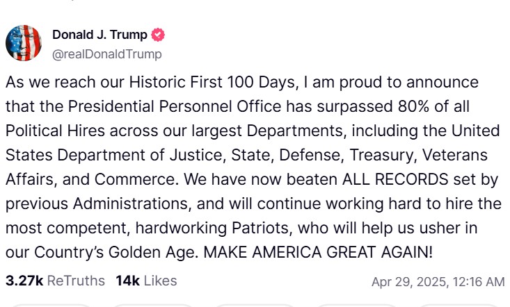 "Досягаючи історичної позначки 100 днів, я з гордістю повідомляю, що управління з роботи з персоналом президента перевищило 80% політичних призначень у наших найбільших міністерствах", – написав американський лідер.