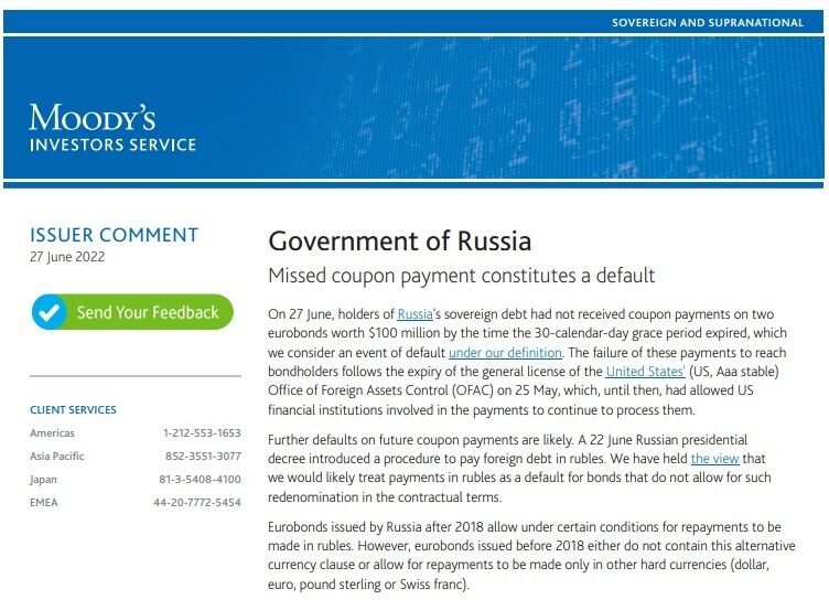 Міжнародне рейтингове агентство Moody's 27 червня підтвердило, що Росія допустила дефолт із зовнішніх боргових зобов'язань.