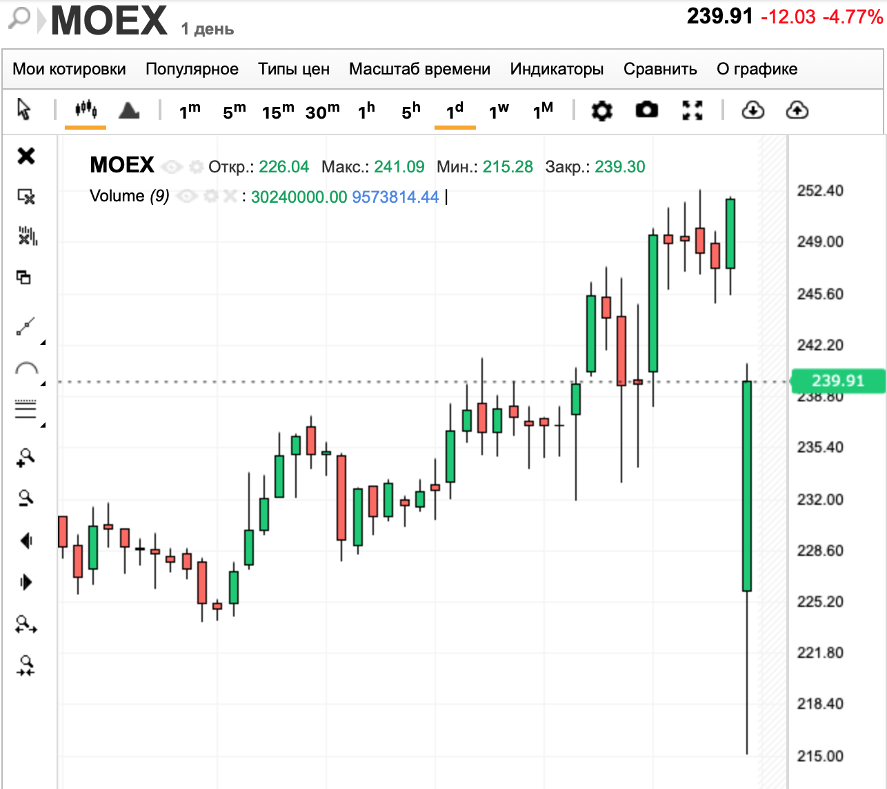 Акції Московської біржі на початку торгів 13 червня впали на 15,8% – до 212,04 руб. (94,64 грн) за штуку на тлі запровадження нових санкцій міністерством фінансів США, повідомляє "Інтерфакс".