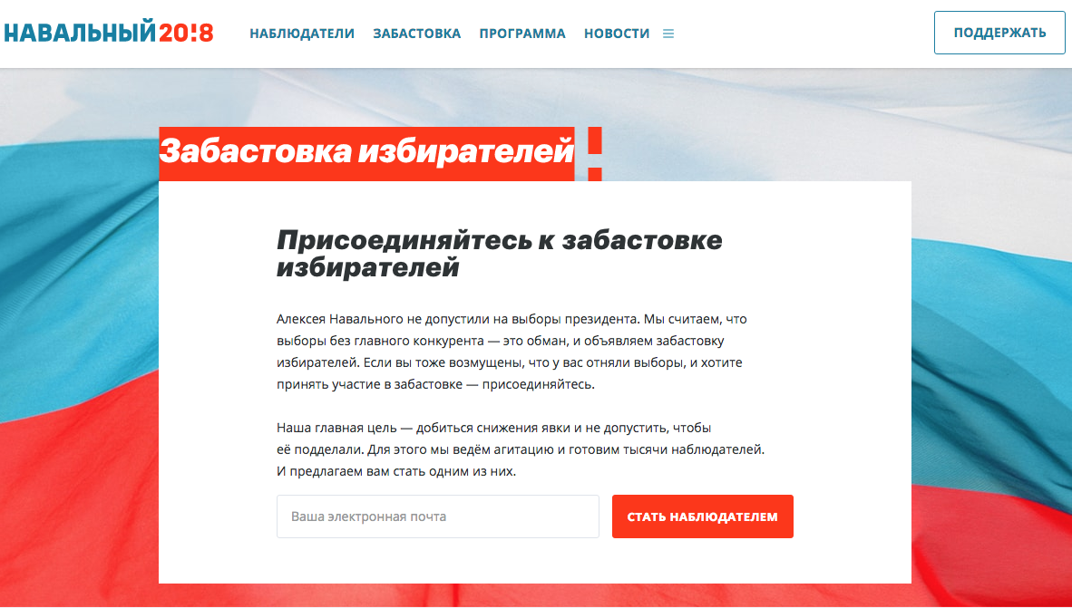 25 грудня 2017 року ЦВК РФ ухвалила рішення про відмову в реєстрації Навального через його судимості. Навальний у відповідь оприлюднив у інтернеті відеозвернення, у якому оголосив про "страйк виборців".