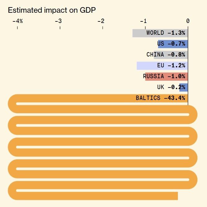 У відсотках від ВВП найбільших втрат зазнали б у разі такого сценарію країни Балтії – мінус 43,4%, пише видання. Окрім того, це позначилося б і на економіках США (через ринкові потрясіння), Китаю (через вищі ціни на енергоносії), Європейського союзу, Великобританії, Росії й решти світу.