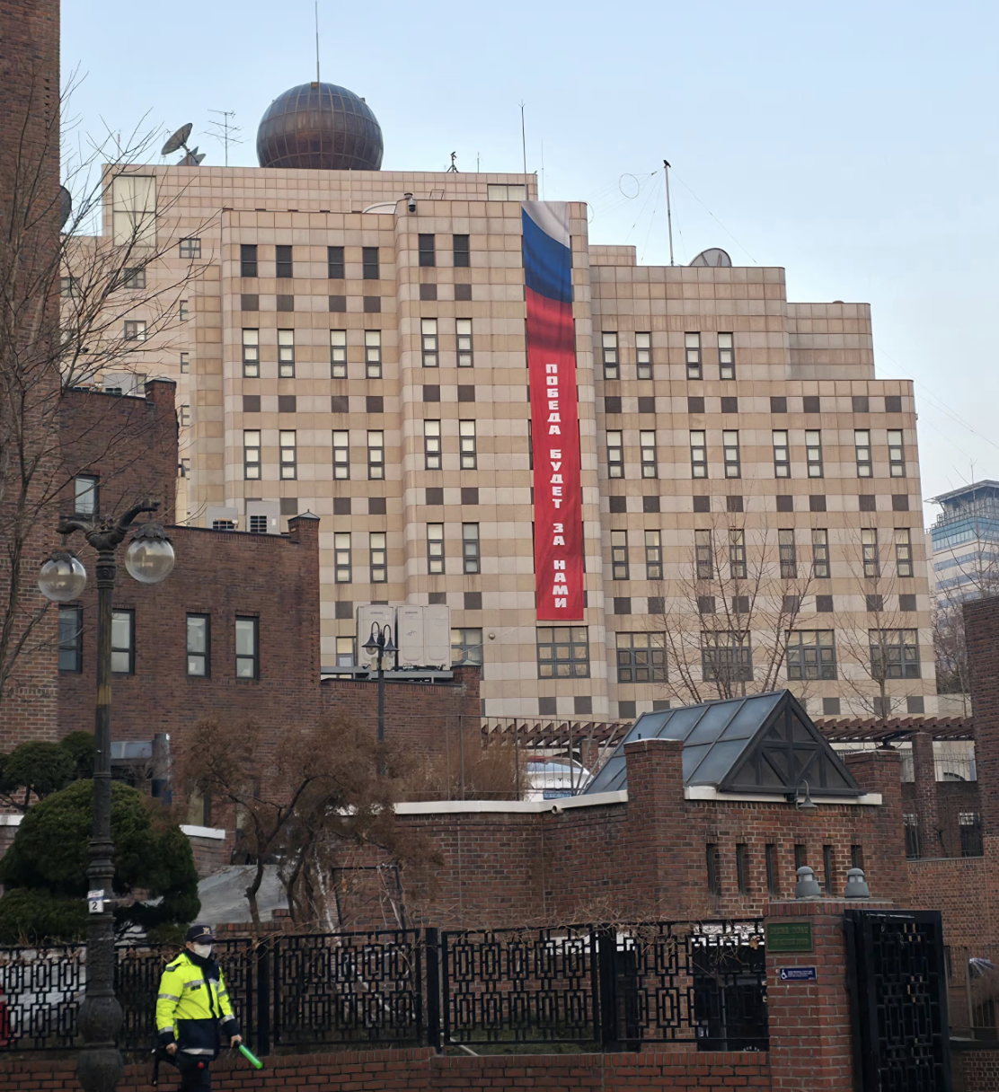 Міністерство закордонних справ Південної Кореї просило прибрати банер, але посольство Росії відмовило. Як пояснює ЗМІ, уряд країни не може примусово видалити його через Віденську конвенцію, яка передбачає недоторканність дипломатичних місій.