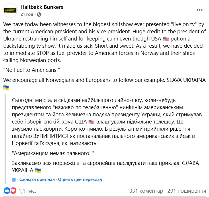 "Ми вирішили негайно припинити постачати паливо американським військам у Норвегії та їхнім кораблям, які заходять у норвезькі порти. "Жодного палива американцям!" Ми закликаємо всіх норвежців і європейців наслідувати наш приклад", – заявила Haltbakk Bunkers.