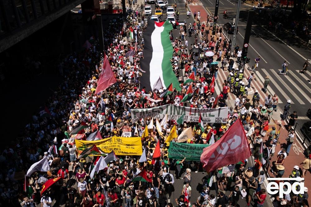 Демонстранти з палестинськими прапорами на мітингу солідарності з Палестиною в Сан-Паулу (Бразилія), 5 жовтня 2025 року. Фото: EPA