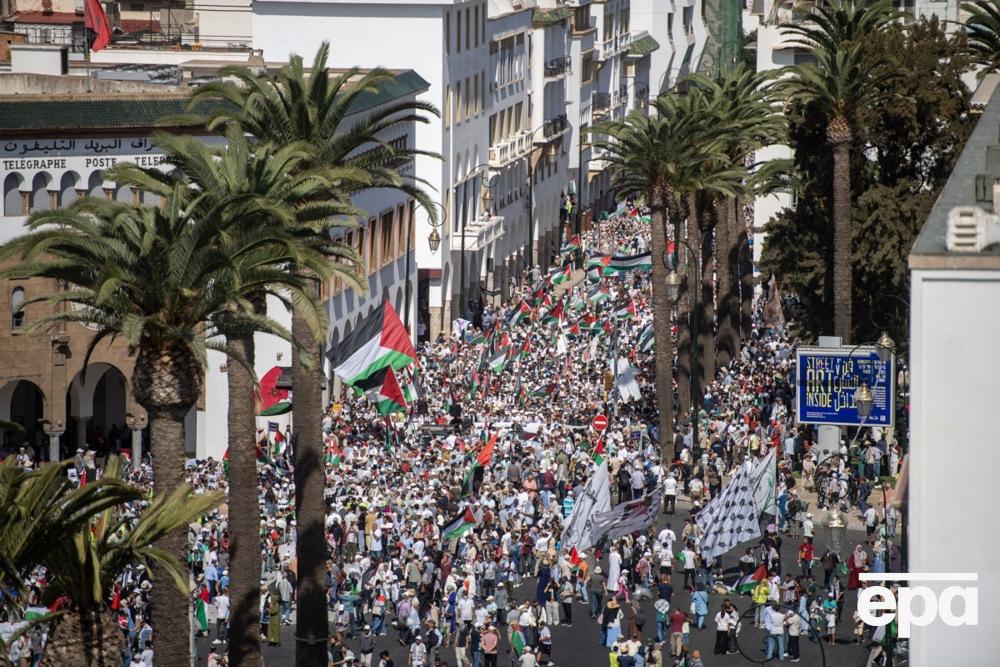 Учасники мітингу з транспарантом і палестинськими прапорами на акції підтримки Палестини в Рабаті (Марокко), 5 жовтня 2025 року. Фото: EPA