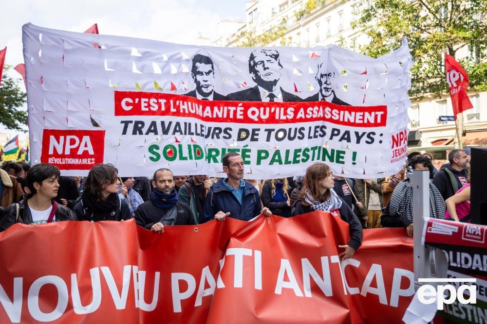 Протестувальники на демонстрації підтримки Палестини і проти перехоплення Ізраїлем суден гуманітарної флотилії в Парижі (Франція), 4 жовтня 2025 року. Фото: EPA