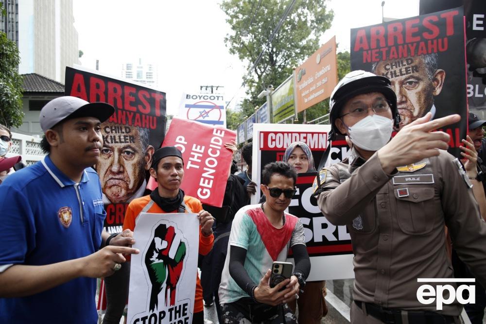 Демонстранти з плакатами проти прем'єр-міністра Ізраїлю Біньяміна Нетаньяху під наглядом тайської поліції біля посольства Ізраїлю в Бангкоку (Таїланд), 4 жовтня 2025 року. Фото: EPA