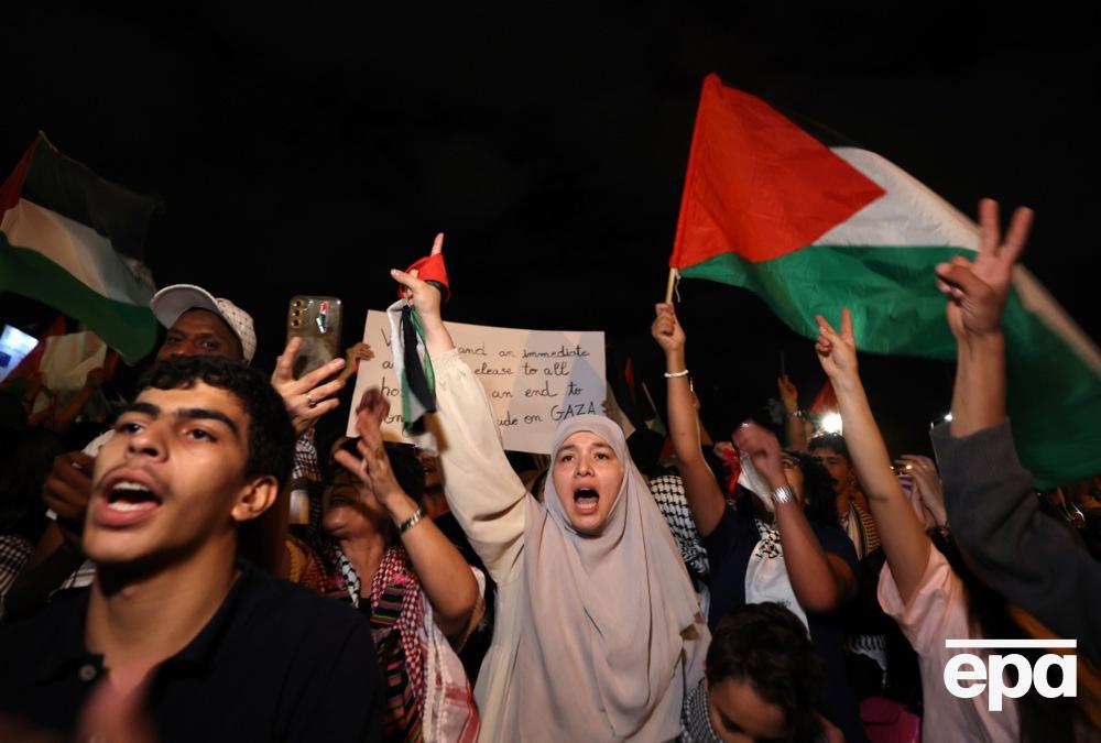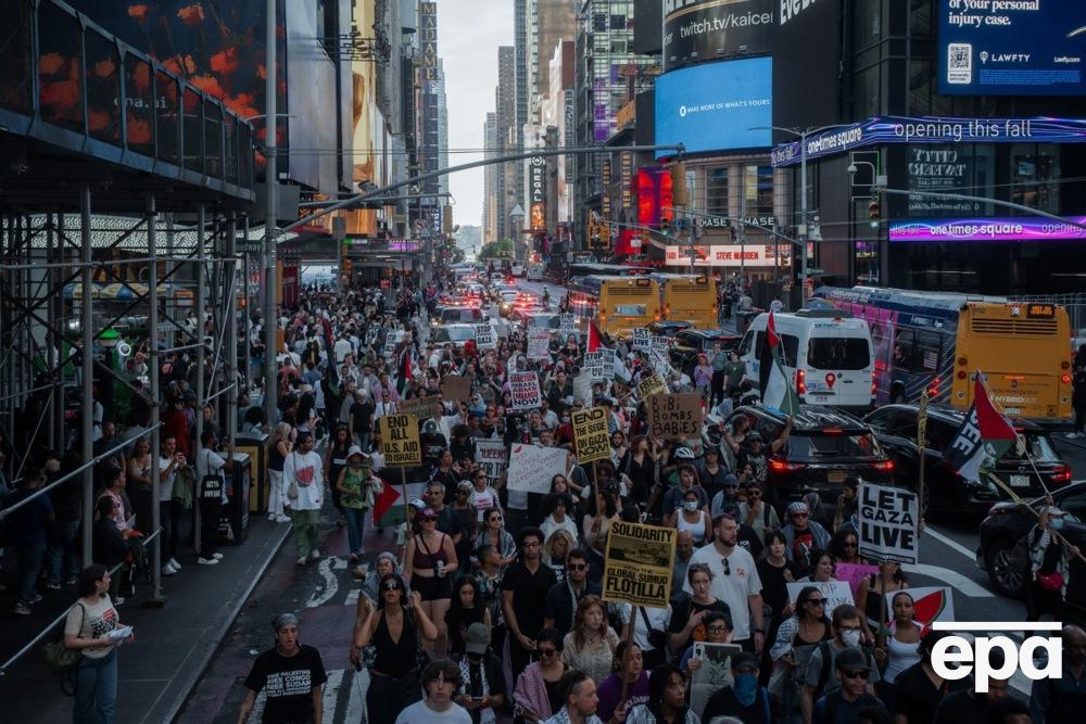 Протестувальники з прапорами вигукують гасла на акції підтримки Палестини у Нью-Йорку (США), 4 жовтня 2025 року. Фото: EPA / Olga Fedorova
