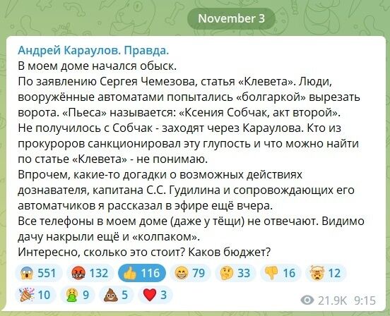 "У моєму будинку розпочали обшук. За заявою Сергія Чемезова, стаття "наклеп". [...] Хто із прокурорів санкціонував цю дурість і що можна знайти за статтею "наклеп" – не розумію", – написав Караулов.
