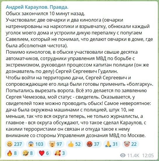 Опівдні Караулов повідомив про завершення обшуку.