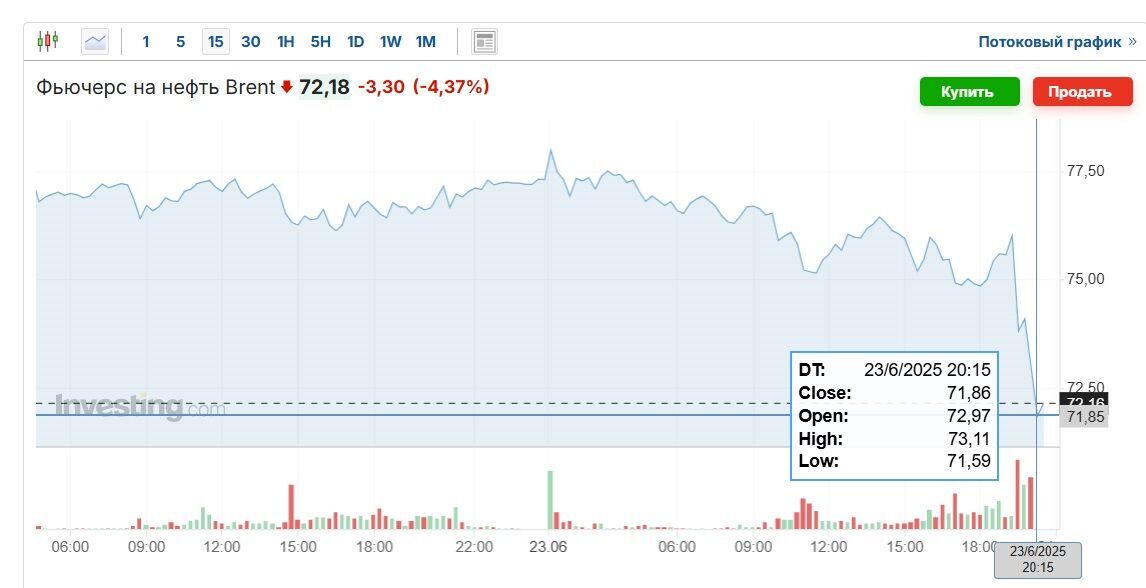 Після цього котирування нафти марки Brent лише за годину – із 19.15 до 20.15 – впали із $74,04 за барель до $71,86 за барель.