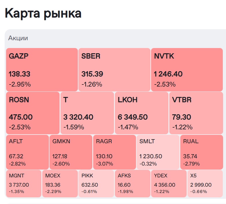 Серед компаній, акції яких упали в ціні (журналісти вказують, що це станом на 11 липня), – Новолипецький металургійний комбінат (здешевшали на 3%), "Совкомфлот" (майже на 3%), "Газпром" і "Аэрофлот" (на 2,9%), "Роснефть" і "Норникель" (на 2,6%), "Северсталь" (на 2,5%), "Газпром нефть" (на 2,2%), "Сбербанк" і банк ВТБ (трохи менше ніж на 1,5%).