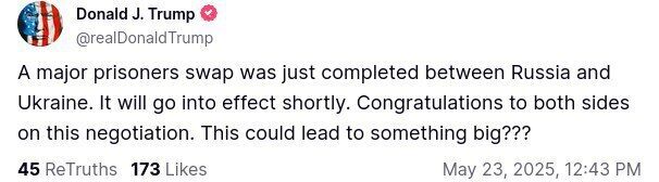 Президент США Дональд Трамп повідомив, що 23 травня завершили великий обмін полоненими між країною-агресором Росією й Україною. Про це американський лідер повідомив у соцмережі Truth Social.