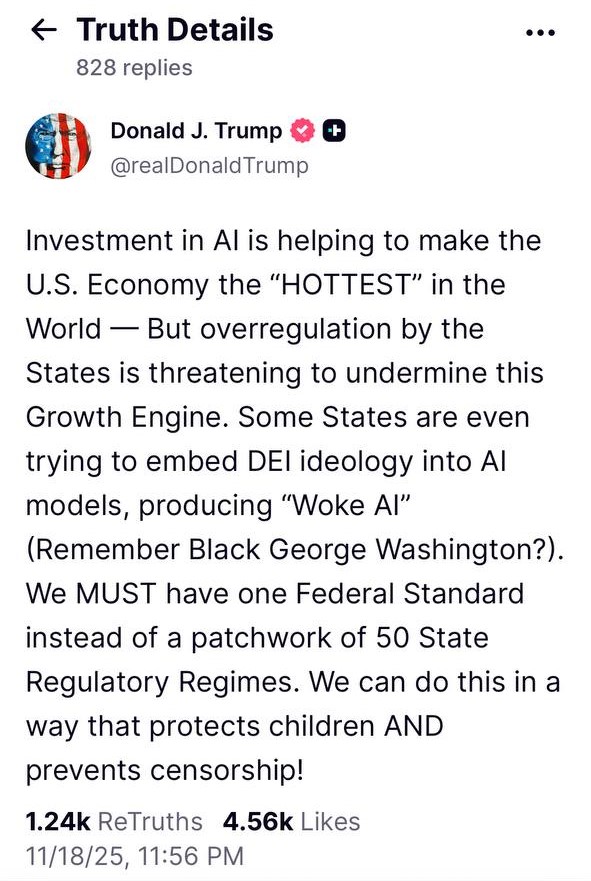 Трамп особливо критикує те, що деякі штати намагаються впровадити ідеологію різноманіття, рівності й інклюзії (DEI) у моделі ШІ, створюючи так званий woke AI. У пості він наводить жартівливий приклад про "Чорного Джорджа Вашингтона", натякаючи на перебільшену політичну коректність у навчанні ШІ.