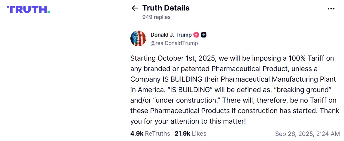"З 1 жовтня 2025 року ми введемо 100-відсоткове мито на будь-яку фірмову або запатентовану фармацевтичну продукцію, за винятком випадків, коли компанія будує свій фармацевтичний завод в Америці", – написав він.