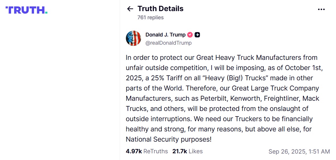 "Отже, наші великі виробники вантажних автомобілів, як-от Peterbilt, Kenworth, Freightliner, Mack Trucks та інші, будуть захищені від натиску зовнішніх перешкод. Нам потрібні фінансовий добробут і стабільність наших далекобійників із багатьох причин, але насамперед – для національної безпеки", – наголосив він.