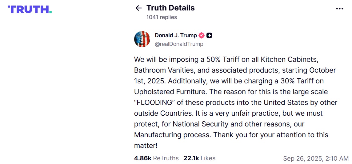 З тієї самої дати, 1 жовтня, наказом Трампа у США вводять 50-відсотковий тариф на всі кухонні шафи, тумби під раковини й супутню продукцію, а також 30-відсотковий тариф на м'які меблі.