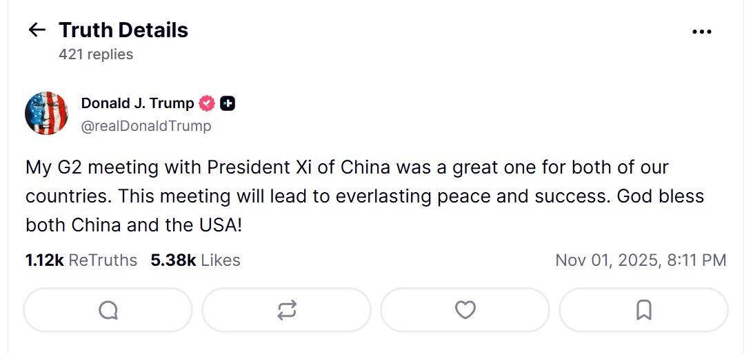Зустріч президента США Дональда Трампа й лідера КНР Сі Цзіньпіна, яка відбулася 30 жовтня, нібито сприятиме "вічному миру". Таку думку глава Білого дому висловив 1 листопада у своїй соцмережі Truth Social.