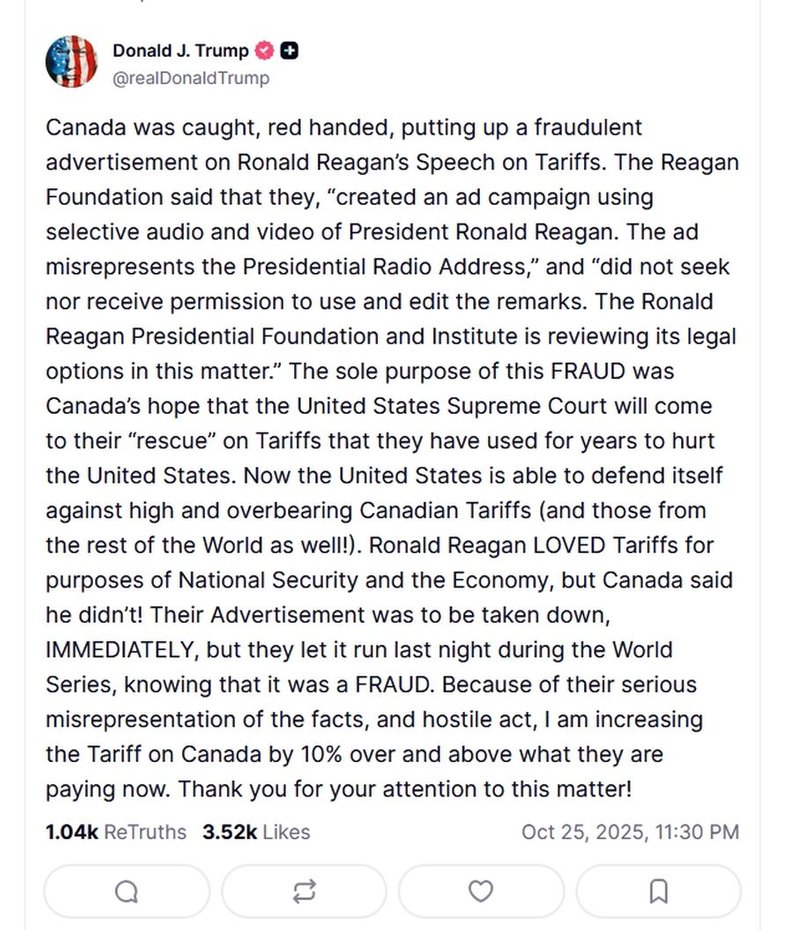"Єдиною метою цього шахрайства була надія Канади на те, що Верховний суд США прийде їй на "допомогу" щодо мит, які вона використовувала протягом багатьох років, щоб завдати шкоди Сполученим Штатам. [...] Рейган любив мита – із міркувань національної безпеки й економіки, але Канада заявила, що він їх не любив! Їхню рекламу мали зняти негайно, але вони дозволили їй вийти в ефір учора ввечері під час Світової серії, знаючи, що це шахрайство. Через їхнє серйозне перекручення фактів і ворожий акт я підвищую мито для Канади ще на 10% понад те, що вони платять зараз", – додав Трамп.