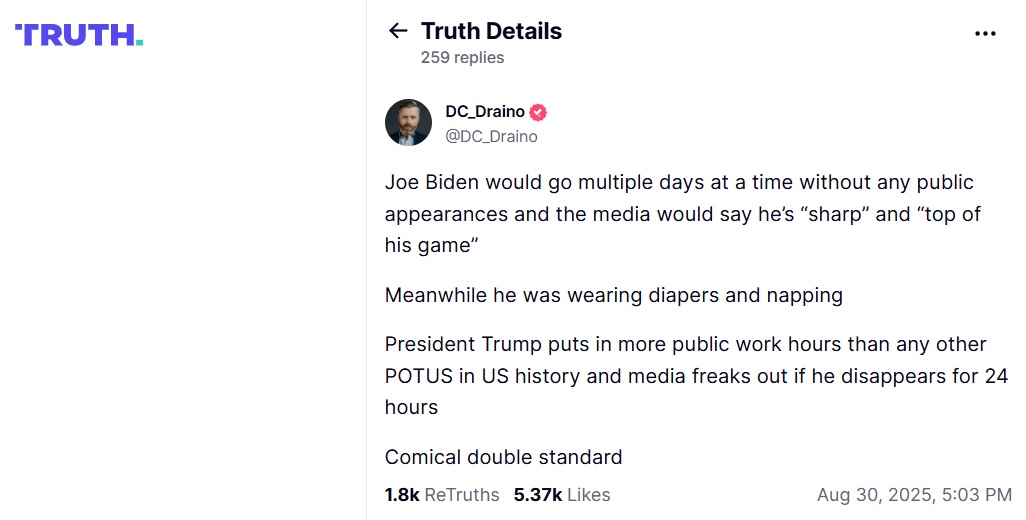 "[Попередній президент США] Джо Байден міг кілька днів поспіль не з'являтися на публіці, а ЗМІ говорили, що він "у чудовій формі" й "на піку форми". Водночас він носив підгузки й спав. Президент Трамп проводить на публіці більше годин, аніж будь-який інший президент США в історії, і ЗМІ впадають в істерику, якщо він зникає на 24 години", – написав О'Гендлі.