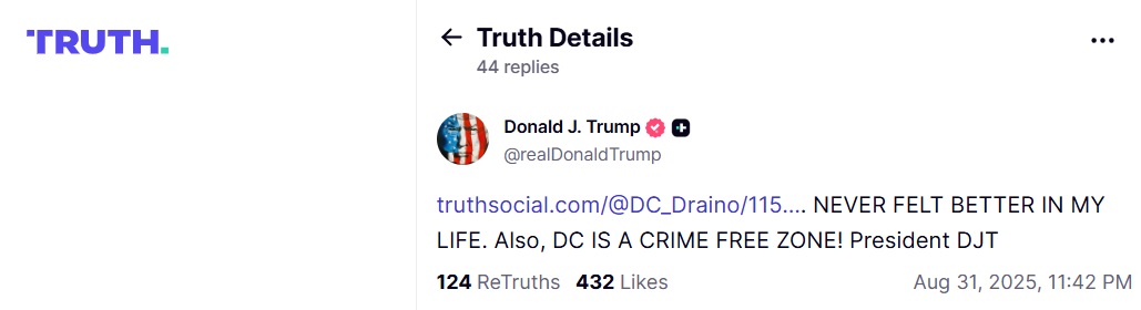 "Ніколи в житті я не почувався краще. Окрім того, округ Колумбія – це зона, вільна від злочинності", – заявив Трамп.