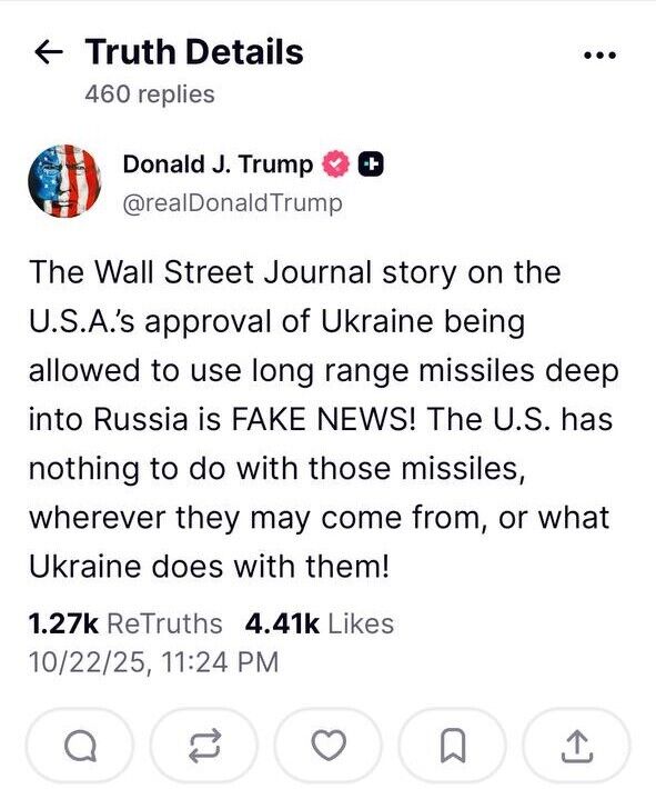 "Стаття The Wall Street Journal про те, що США нібито дозволили Україні використовувати далекобійні ракети глибоко на території Росії, – фейк! США не мають жодного стосунку до цих ракет, хай звідки вони походять, і до того, що з ними робить Україна!" – написав американський лідер.