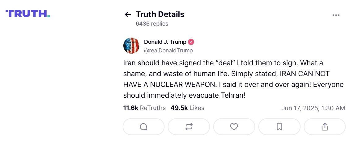 "Іран мав підписати [ядерну] угоду, про яку я їм говорив. Яка ганьба й марна трата людських життів. Простіше кажучи, Іран не може мати ядерну зброю. Я говорив це знову і знову. Усі мають негайно евакуюватися з Тегерана", – написав глава Білого дому.
