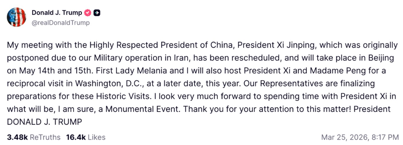 Візит Трампа в Китай і його зустріч із Сі Цзіньпіном мали відбутися протягом 31 березня – 2 квітня, однак глава Білого дому оголосив про відтермінування своєї поїздки. Пізніше, 19 березня, американський президент припустив, що його саміт із лідером КНР може відбутися в середині травня, і він очікує на "чудову поїздку". За даними джерел Politico, Трамп не планував призначати нову дату майбутньої зустрічі з лідером КНР, допоки не завершиться активна фаза війни з Іраном.