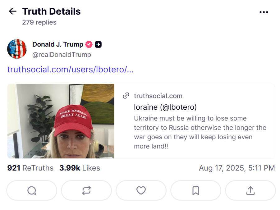 За годину до того у Truth Social Трамп зробив репост допису користувачки соцмережі про Україну.