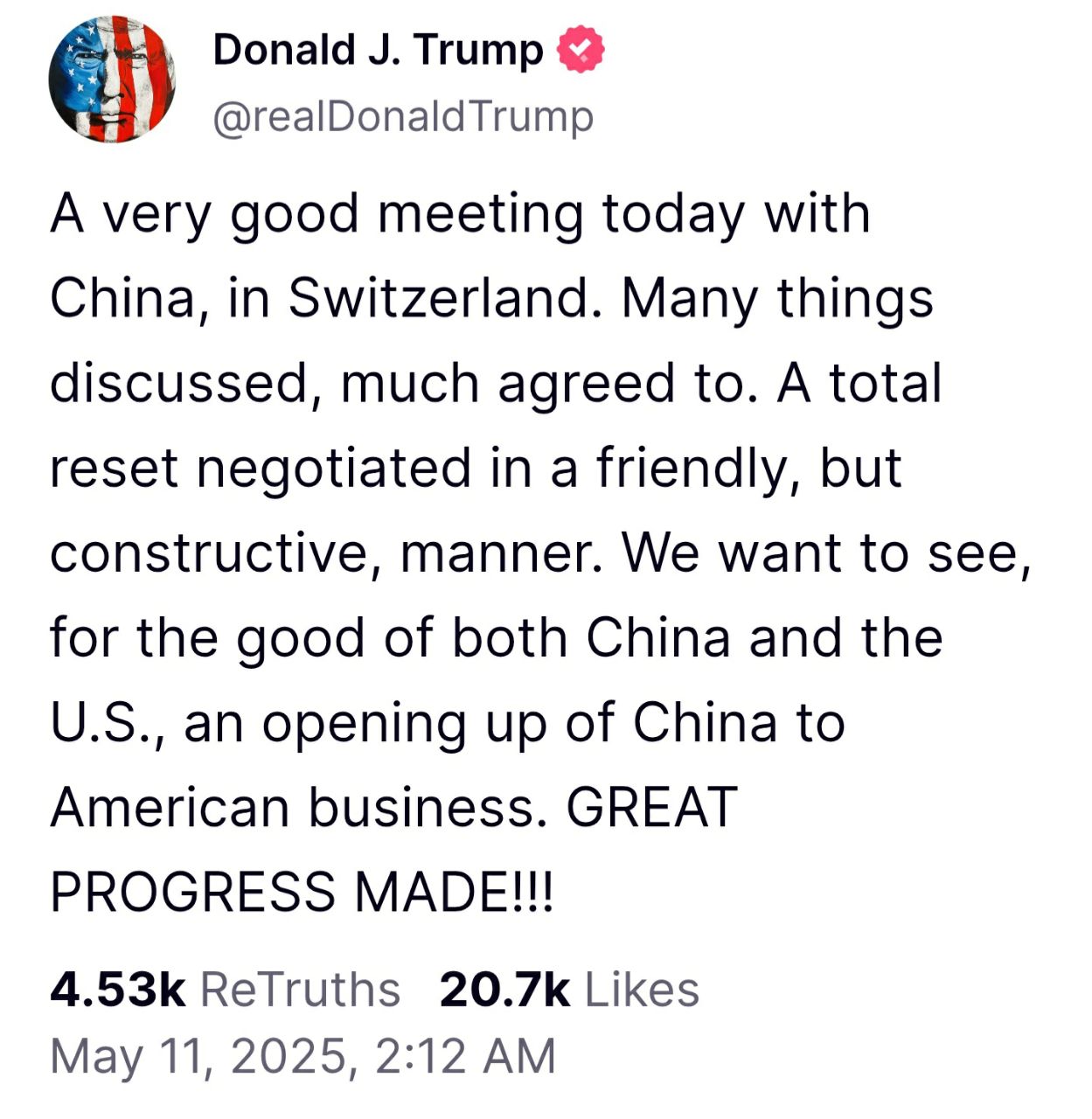 "Дуже гарна зустріч сьогодні з Китаєм у Швейцарії. Багато чого обговорили, багато про що домовилися. Повного перезавантаження досягли у дружній, але конструктивній манері. Ми хочемо бачити, для блага як Китаю, так і США, відкриття Китаю для американського бізнесу. Досягнуто великого прогресу!" – заявив Трамп.