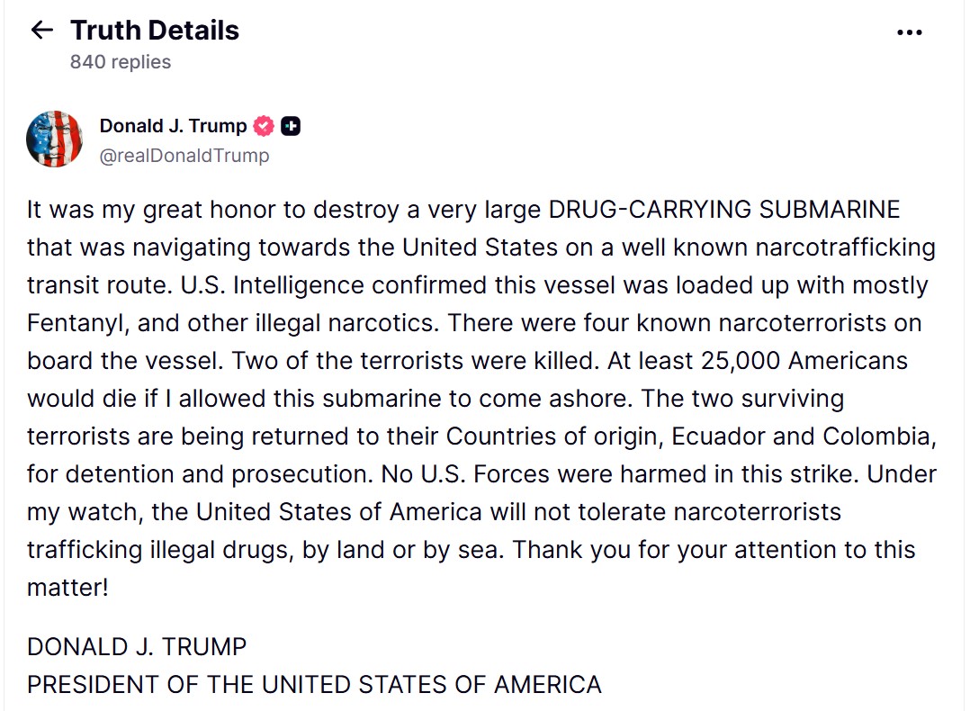 "Якби я дозволив цьому підводному човну дістатися суші, щонайменше 25 тис. американців загинули б. Двоє вцілілих терористів повертаються до країн їхнього походження – Еквадору й Колумбії – для затримання та притягнення до суду. Жодні сили США не постраждали внаслідок цього удару", – написав Трамп.