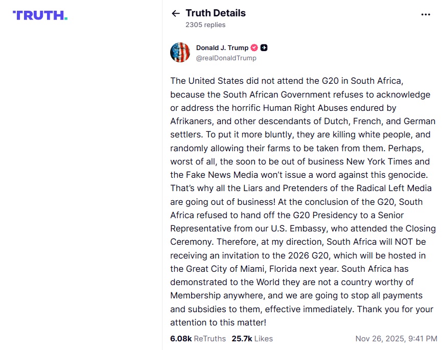 Глава Білого дому нагадав, що США не були на саміті G20, який відбувся 22–23 листопада в Південній Африці, через нібито "жахливі" порушення прав африканерів (громадян європеоїдної раси).
