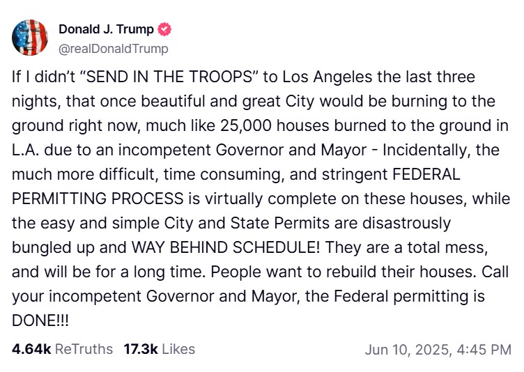 "Якби я не "скеровував війська" до Лос-Анджелеса впродовж останніх трьох ночей, це колись прекрасне й величне місто зараз згоріло б ущент – як 25 тис. будинків, які згоріли вщент у Лос-Анджелесі через некомпетентного губернатора і мера", – заявив Трамп.