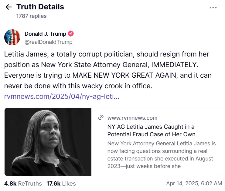 До свого поста глава Білого дому додав посилання на матеріал RVM News дводенної давності про те, що "Джеймс піймалася у справі про потенційне шахрайство".