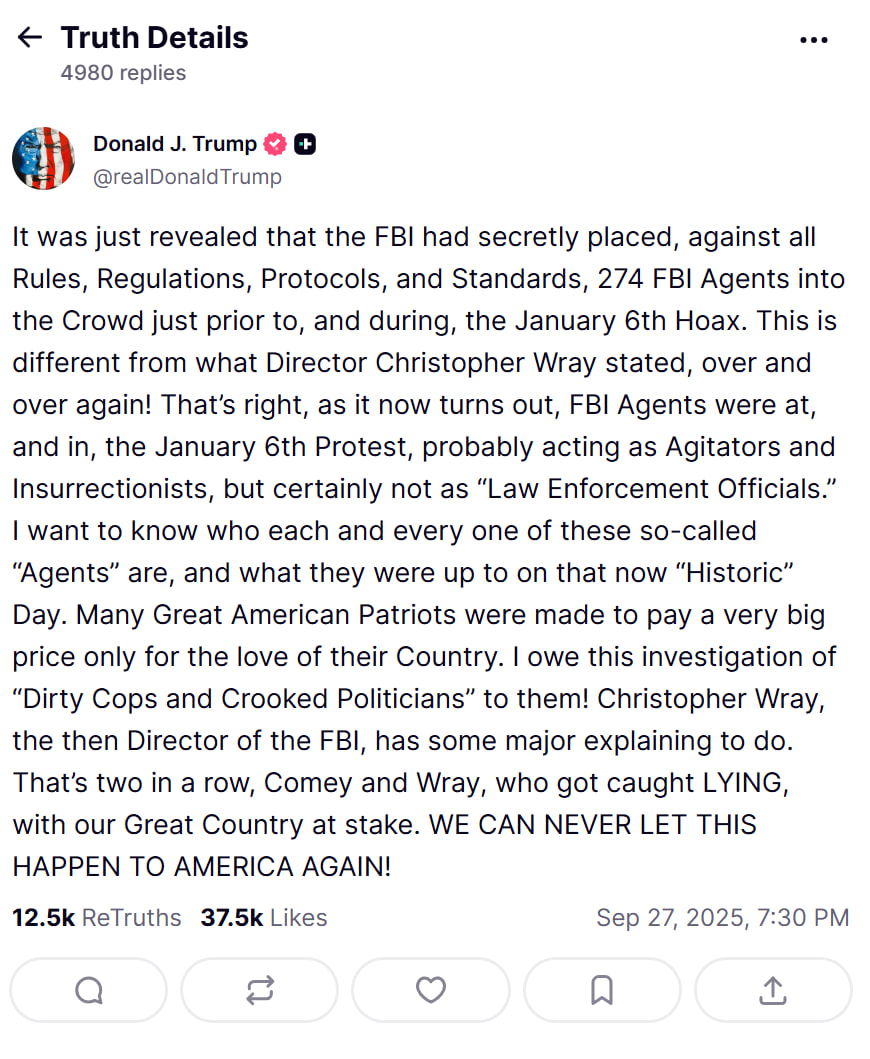 "Щойно стало відомо, що ФБР таємно розмістило, всупереч усім правилам, регламентам, протоколам і стандартам, 274 агентів ФБР у натовпі безпосередньо перед і під час містифікації 6 січня. Це відрізняється від того, що неодноразово заявляв директор Крістофер Рей! Саме так, як виявилося, агенти ФБР були на протесті 6 січня і брали в ньому участь, імовірно, вони діяли як підбурювачі й повстанці, але, безумовно, не як співробітники правоохоронних органів", – наголосив Трамп.
