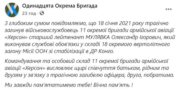 "18 січня 2021 року трагічно загинув військовослужбовець 11-ї Окремої бригади армійської авіації "Херсон" старший лейтенант Мулявка Олександр Ігорьович, який виконував службові обов'язки у складі 18-го окремого вертолітного загону місії ООН зі стабілізації в ДР Конго", – ідеться в повідомленні.