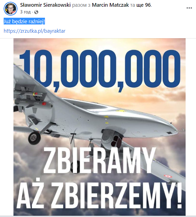 У Польщі на безпілотник Bayraktar для України зібрали вже понад 10 млн злотих ($2,1 млн) із 22,5 млн заявлених ($4,7 млн). Про це повідомив у Facebook ініціатор збору, польський журналіст Славомір Сєраковський 10 липня.