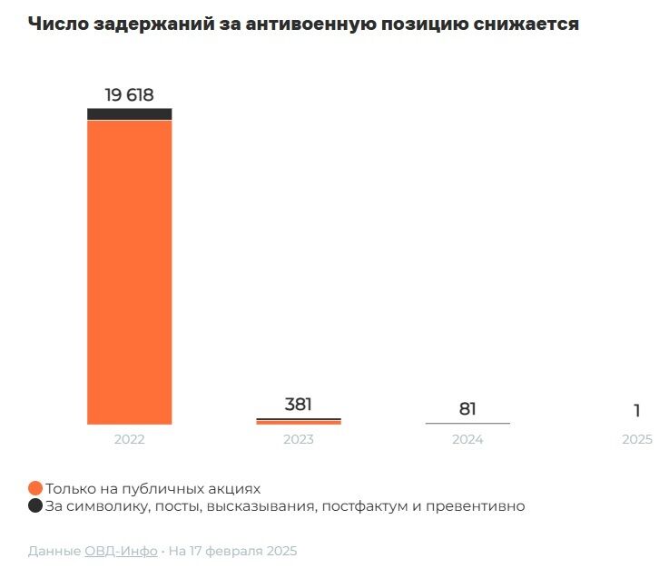 "За три роки війни силовики 856 разів затримали людей через антивоєнні пости, символіку та з інших приводів, які могли бути прямо чи опосередковано пов'язані з війною. У цю категорію потрапили як публікації з відкритою критикою війни в Україні, так і об'єкти, які могли не бути політичним висловлюванням, наприклад, синьо-жовтий шеврон на рюкзаку. До кінця 2024 року приводом для більшості затримань протягом року, які не пов'язані з публічними акціями, були пости в соцмережах", – наголошує "ОВД-Инфо".