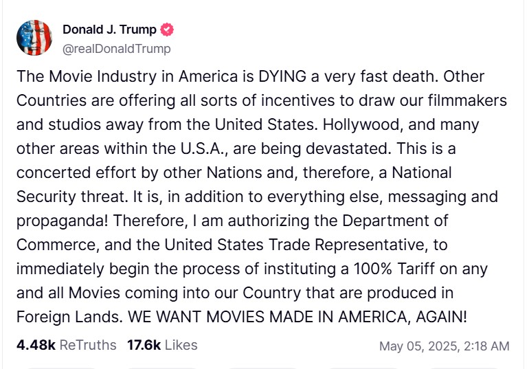 Трамп заявив, що "кінoіндустрія в Америці стрімко вмирає", адже "інші країни пропонують усілякі стимули", щоб переманити американських кіновиробників і студії з території США.