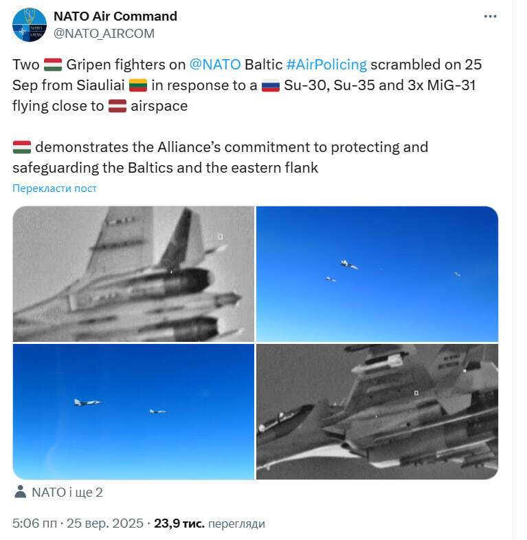 25 вересня два угорські винищувачі Gripen перехопили п'ять російських військових літаків. Про це поінформувало командування повітряних сил НАТО в соцмережі Х.